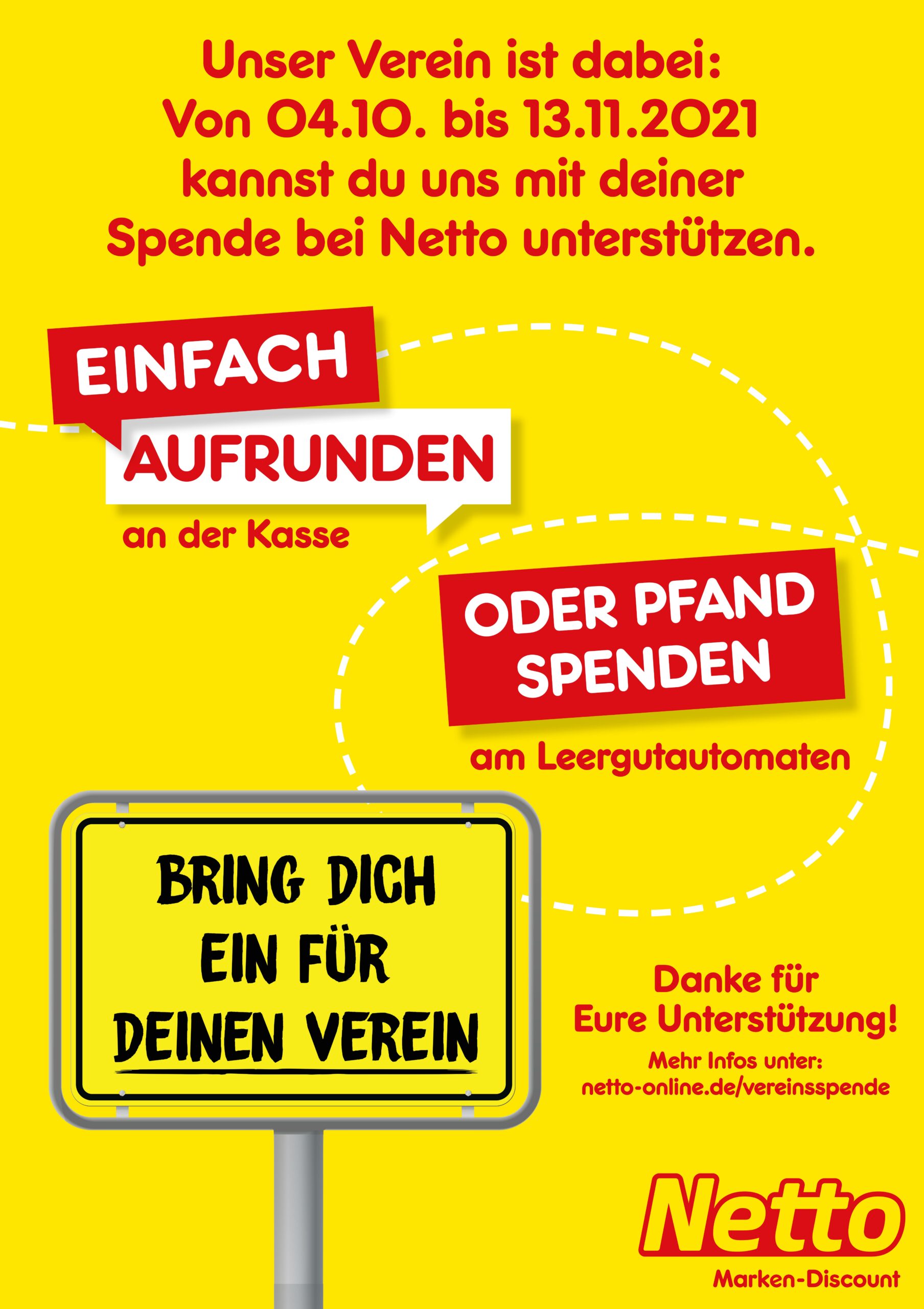 Vom 04.10.21-13.11.2021 könnt ihr den zugeteilten Netto-Filialen am Pfandautomaten oder durch Aufrunden an der Kasse für uns spenden. Jeder Cent zählt und bringt uns voran, was am Ende bei rumkommt sehen wir dann.